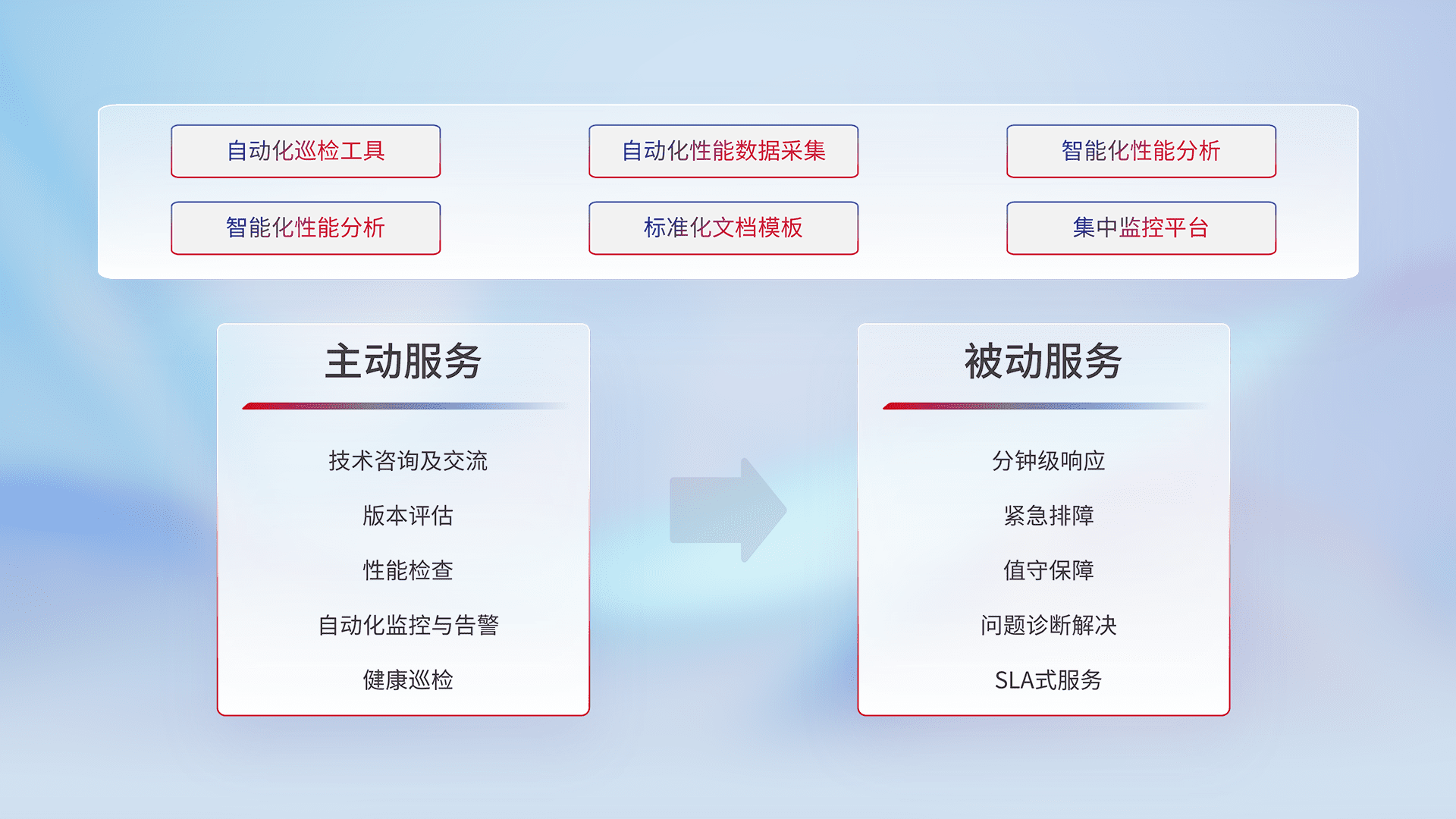 智能化工具和标准化文档,,保障服务质量,,,,提供主动服务(包含技术咨询、、版本评估、、性能检查、、、、自动化监控与告警、、健康巡检)和被动服务包含(分钟级响应、、紧急排障、、值守保障、、问题诊断解决、、、SLA服务)。。。